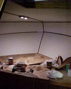Toukokuussa siirryimme "viimeiseen savottaan", etuhytin ja WC:n sisustukseen. Hauskin vaihe oli WC:n oven tekeminen, siinä pääsi taas käyttämään mielikuvitustaan ja kokeilemaan uutta.